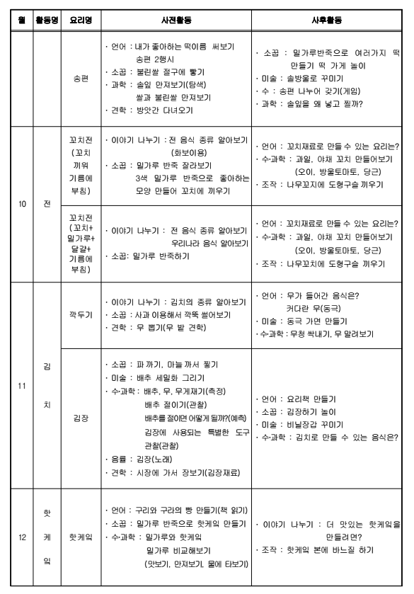 ② 유아들의 요리에 대한 관심과 접근이 쉽도록 교육 프로그램에 따른 교육 활동 주제 계절 명절 등을 , ,
