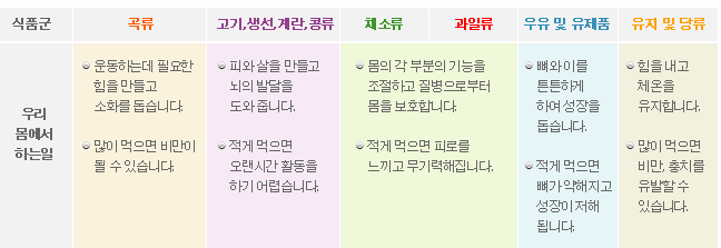 -우리가 주로 먹는 식품의 종류와 영양소 함유량 기능에 따라 비슷한 것끼리 묶어 6가지 식품군으로 나누고