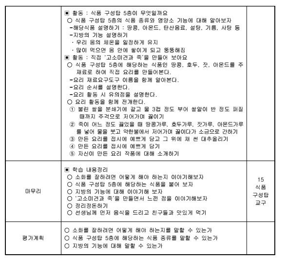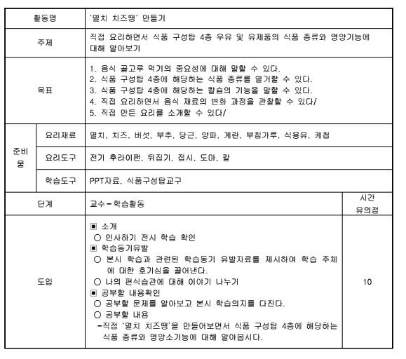 2. 요리활동 멸치 치즈땡 만들기 로 직접 요리하면서 식품구성탑 4층의 식품종류와 영양기능에 대해 알아 다 .