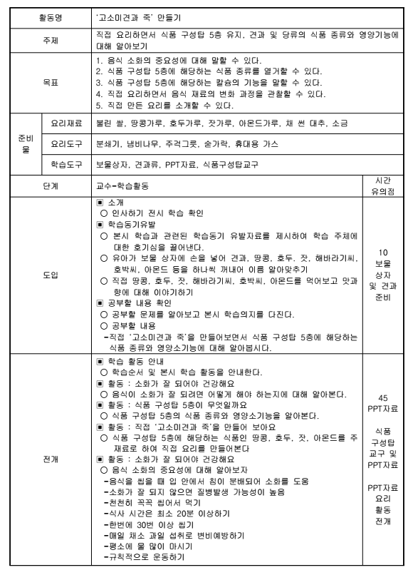 3. 요리활동 고소미견과 죽 만들기기 로 직접 요리하면서 식품구성탑 5층의 식품종류와 영양기능에 대해