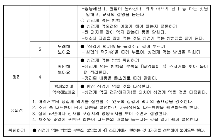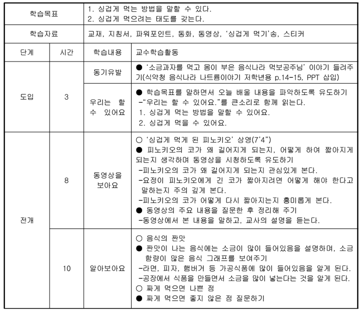 2. 식약청 <유아식생활과 건강지침서>의 싱겁게 먹기 와 골고루 먹어요 교육안을 통해 실제를 이해한다.