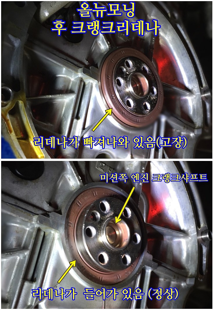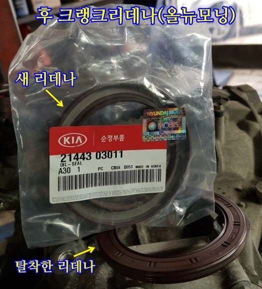 올뉴모닝부터는 개선된 리데나를 사용해서 크랭크리데나 불량으로 인한 오일누유 문제는 없어졌습니다.