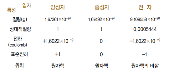 1] 원자는 원자핵과 그 주위를 도는 전자로 구성된다. 2] 원자핵은 양성자와 중성자로 결합되어 있다. 3] 양성자는 (+) 전기를 띤다. 4] 중성자는 (–) 전기를 띤다.☞중성자는 전기를 띠지 않고 전자가 (–) 전기를 띠고 있다.