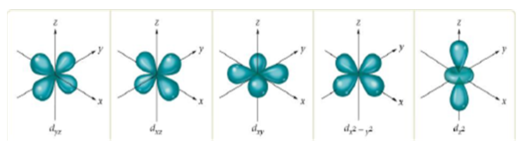 ③ d 궤도함수(d orbital) n=3, l=2 (에너지는 동일하 ,x y x축 관련 5가지 방향 나타냄)