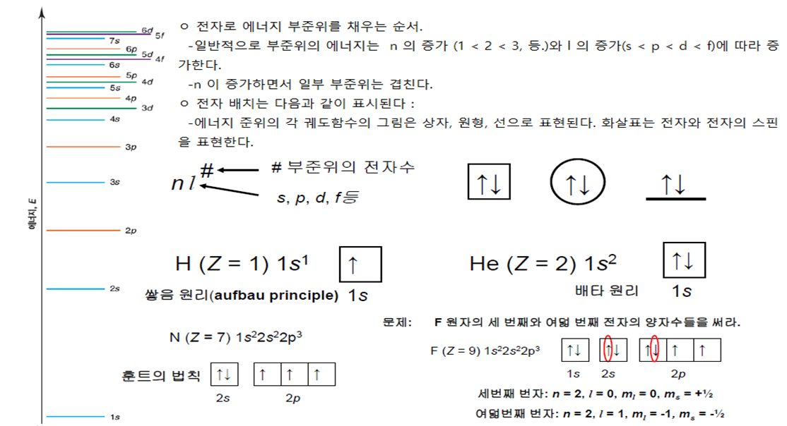 -쌓음 원리(aufbau principle) : 전자는 항상 가장 낮은 에너지 부준위부터 채워진다.