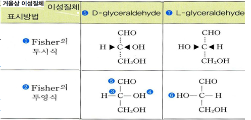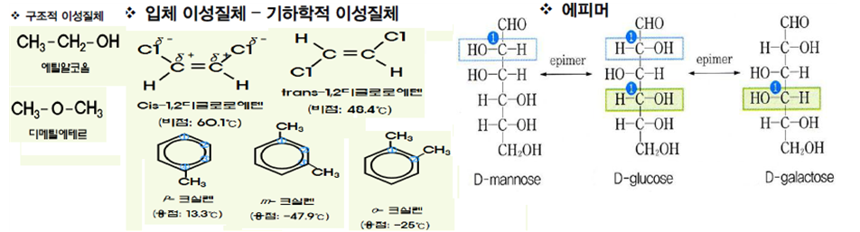 입체적 이성질체 : 기하학적, 에피머, 거울상(광학적, D/L형, 아노머)