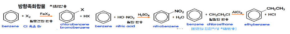 ㉯ 방향족 탄화수소의 이중결합의 파이결합 전자들은 공명상태에 있기 때문에 지방족 탄화수소의 이중결합의 파이결합 전자보다는 핵과 가까이 존재하므로 반응성이 약하여 방향족 화합물은 알켄보다 반응성이 적다. 치환 반응을 한다.