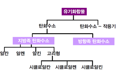 (1) 지방족 탄화수소 : 탄소들이 사슬모양으로 연결되어 있는 것으로서 탄소 간 결합의 종류, 탄소사슬의 고리구성 등에 따라 분류된다.