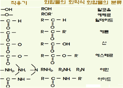 ㅇ 작용기(functional group)-화합물을 계열별로 분류가 가능하도록 만들어 주는 구조적인 특징. 탄화수소부분은 반응성이 매우 낮은데 반해 작용기는 극성을 가지고 있거나 수용액에서 이온상태로 존재하기 때문에 반응성이 강하여 작용기가 해당 분자의 특성에 큰 영향을 미친다.