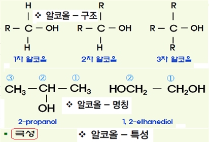 ⦁알코올(alcohol) : 알코올기(-OH)를 가지고 있는 유기화합물