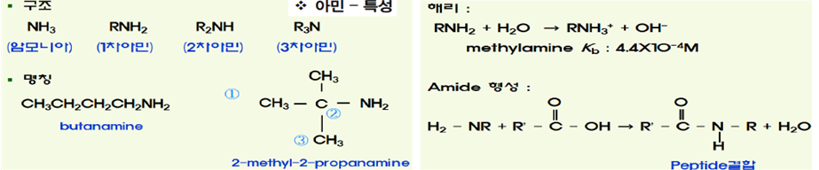 ①암모니아의 수소가 알킬기 혹은 아릴기로 친환된 것, ②아미노산은 1차 아민, 약염기, ③ 펩티드결합
