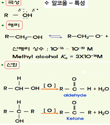 ㉯ 알코올을 물에 용해하면 수소이온이 해리되어 약한 산의 성질을 가지며,물보다 더 약한 산이다. methyl alcohol과 ethyl alcohol의 해리상수는 3×10-16M이다.