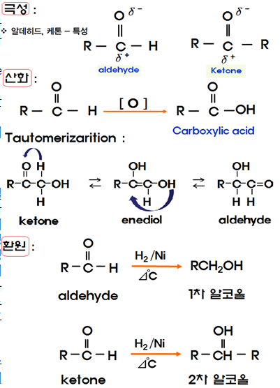 ①산소-음극성, 탄소-양극성,→물에 잘 용해, ②카르보닐화합물, ③산화→카르복시산, ④알데하이드+알코올→헤미아세탈