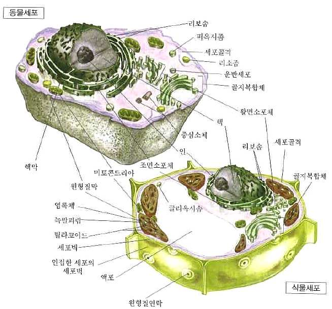 ·식물세포는 동물세포와는 달리 세포벽, 엽록체,액포, 글리옥시솜이 존재하고 동물세포에는 퍼옥시좀이 존재한다.