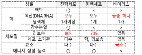 ⦁바이러스(virus) : DNA, RNA 중에 한 가지만 존재하고 효소의 종류와 양이 충분하지 않아 스스로 번식할 수 없는 생물과 무생물의