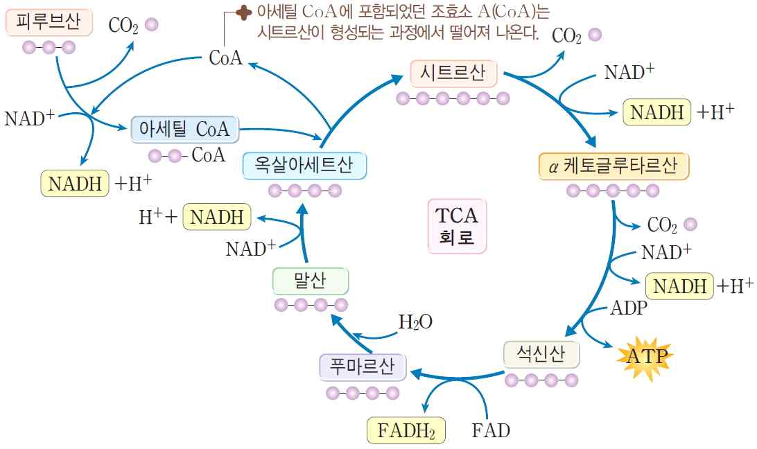 ⦁크랩스회로(krebs cycle) : 호기성 에너지생산 대사의 한 종류로서 해당작용에서 최종생산물인 pyruvic acid로부터 생산된 acetylCoA가 이산화탄소로 분해되면서 GTP, NADH, FADH₂를 생산하는 회로
