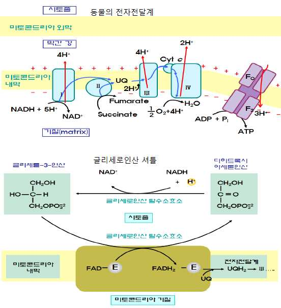 ⦁글리세로인산 셔틀(glycerophosphate shuttle) : 동물세포의 해당작용에서 형성된 NADH의 전자가 전자전달계에 전달되는 과정으로서 전자를 미토콘드리아에 있는 FAD에 전달한다. 포유류의 근육과 뇌 세포에서 일어난다.