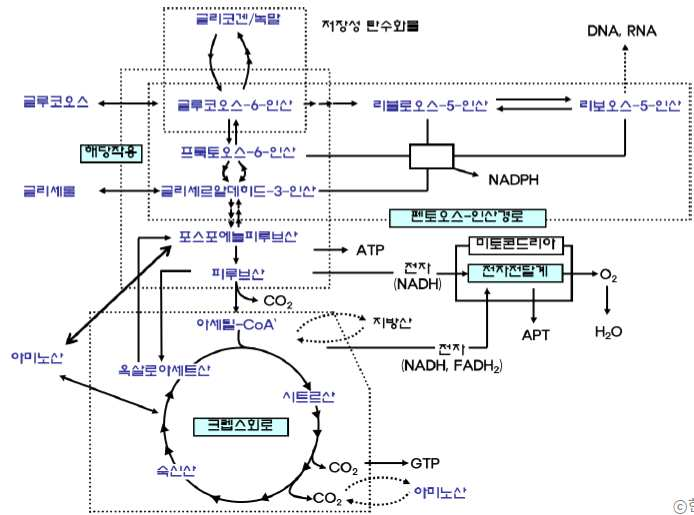 → 동물의 에너지생산 대사체계는 해당작용 → 크렙스회로 → 전자전달계에 이르는 한 가지 체계이며 글루코오스 한 분자당 30 혹은