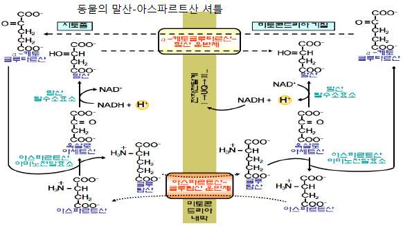 ⦁말산-아스파르트산 셔틀(malate-aspartate shuttle) : 동물세포의 해당작용에서 형성된 NADH의 전자가 전자전달계에 전달되는 과정으로서 전자를 미토콘드리아에 있는 NAD⦁에 전달한다. 포유류의 간, 심장, 신장세포에서 일어난다.