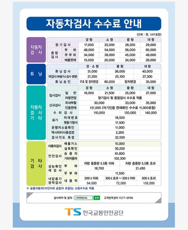 공단 검사 수수료는 종합검사 기준 경차는 48,000원, 소형차는 54,000원, 중형차는 56,000원, 대형차는 65,000원으로 책정됩니다.