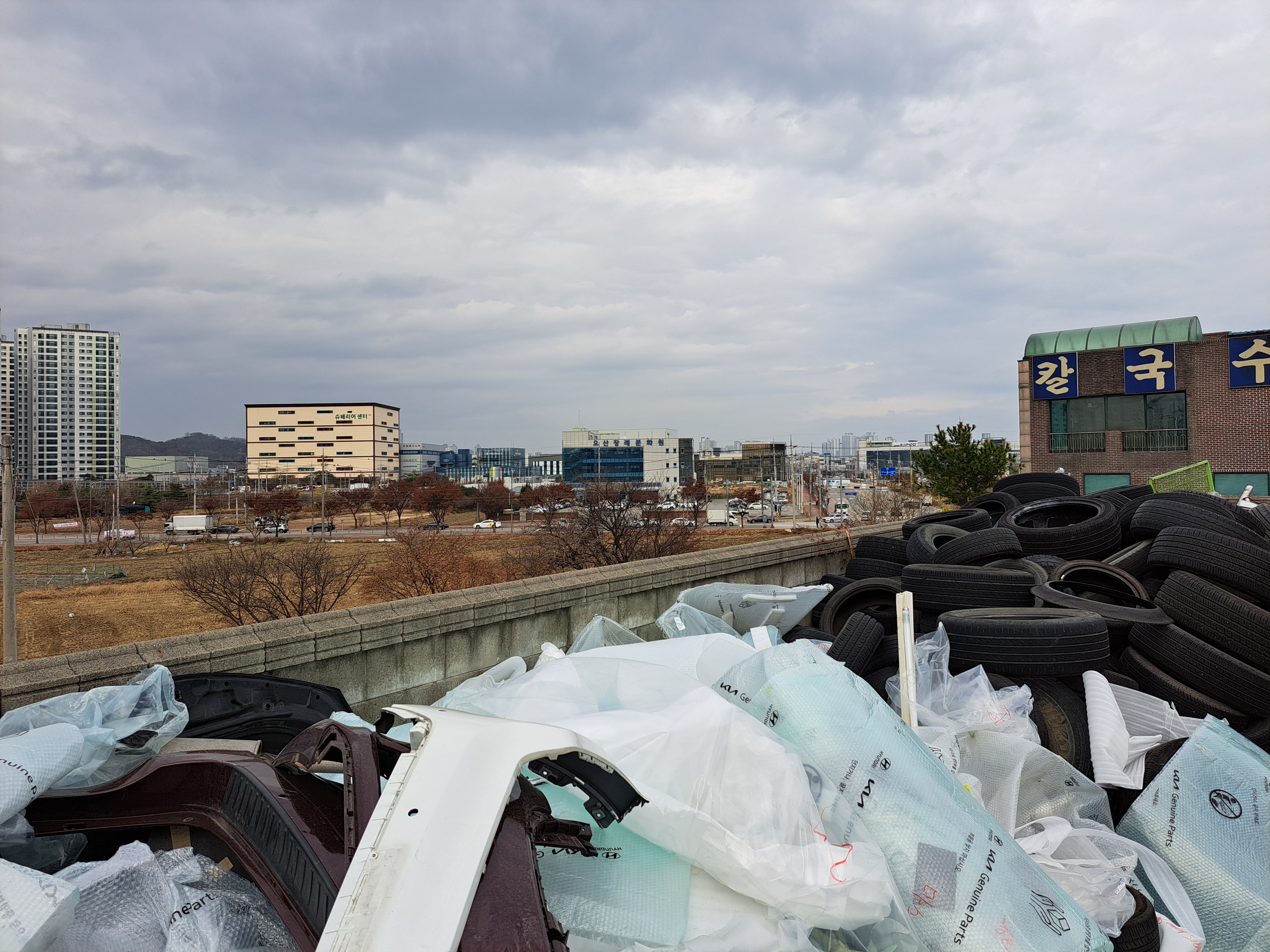 쌓아놓은 자동차 폐기물들이 인상적이네요;;