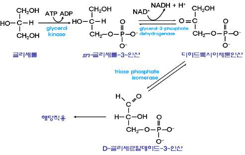 ㉮ 글리세롤-3-P로 전환되어 중성지방 합성에 이용된다. ㉯ 글리세르알데히드-3-P로 전환되어 에너