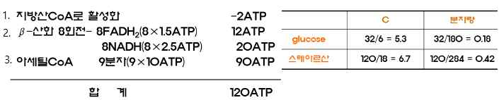 ⑤탄소 1개당 ATP생산량은 탄수화물과 비슷하지만 분자량당 ATP