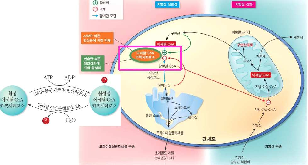 ②에너지원 과다→아세틸CoA과다→옥살로아세트산 부족→