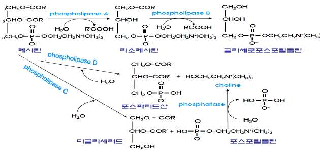 포스포리파아제 A, B, C, D에 의해 지방산, 제2알코올, 인산