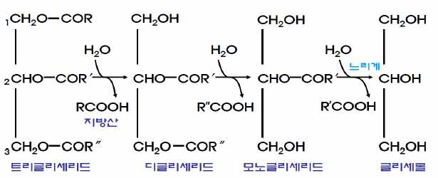 지방의 가수분해 (트리글리세리드 → 글리세롤 + 지방산)
