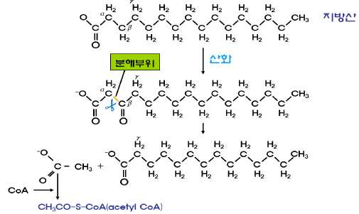 지방산의 β-탄소가 산화하는 β-산화과정을 통하여 산화