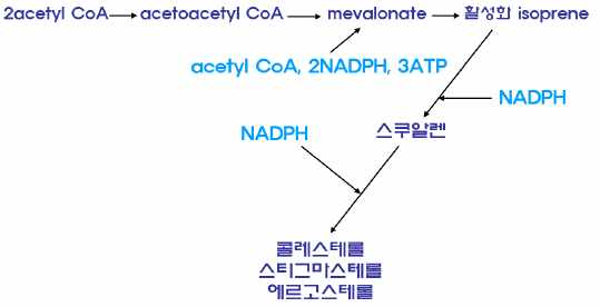 ⦁스테로이드 물질 합성경로는 acetate mevalonate pathway와 methyl eryhriol phosphate pathway인데 동물에서는 acetate
