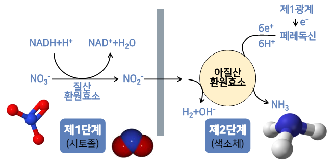 아질산이온으로 환원되고 색소체로 이동하여 암모니아로 환원된다. 암모니아는 독성을 나타