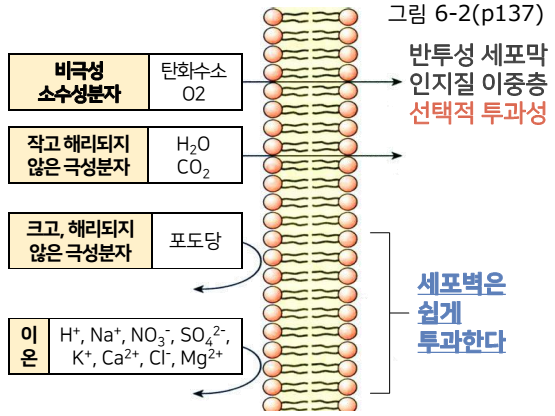 세포막은 ⑦ 으로 선택적 투과성을 지니고 있다. 이러한 투과성은 인지질과 단백질로 구성