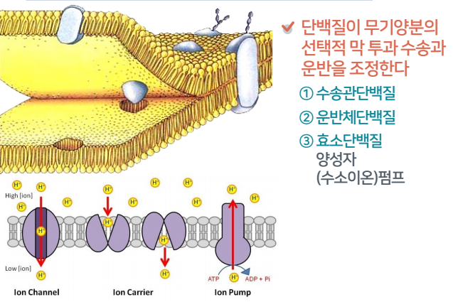 ②. 세포막은 인지질이중층에 운반체 역할을 하는 단백질이 군데군데 박혀 있어 무기양분