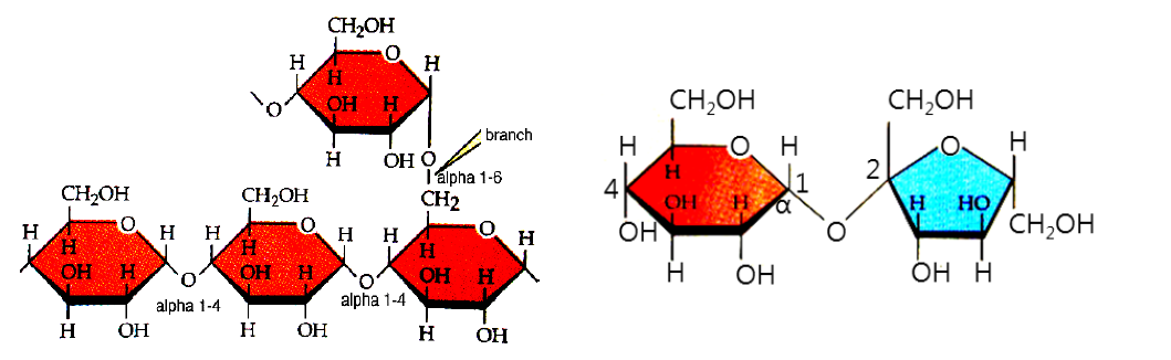 하는 선형의 중합체이며, 아밀로펙틴은 아밀로오스 결합에서 α–(1,6)결합의 곁가지를 갖는