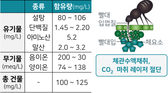 ①. 체관에서 채취한 수액을 분석해 보면 동화산물의 수송형태를 알 수 있는데 설탕이 가