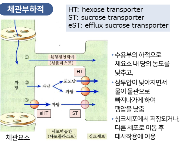 물이 이동하여 팽압을 높게 한다. 한편으로 수용부위에서는 체관부하적이 일어나 그 반대의