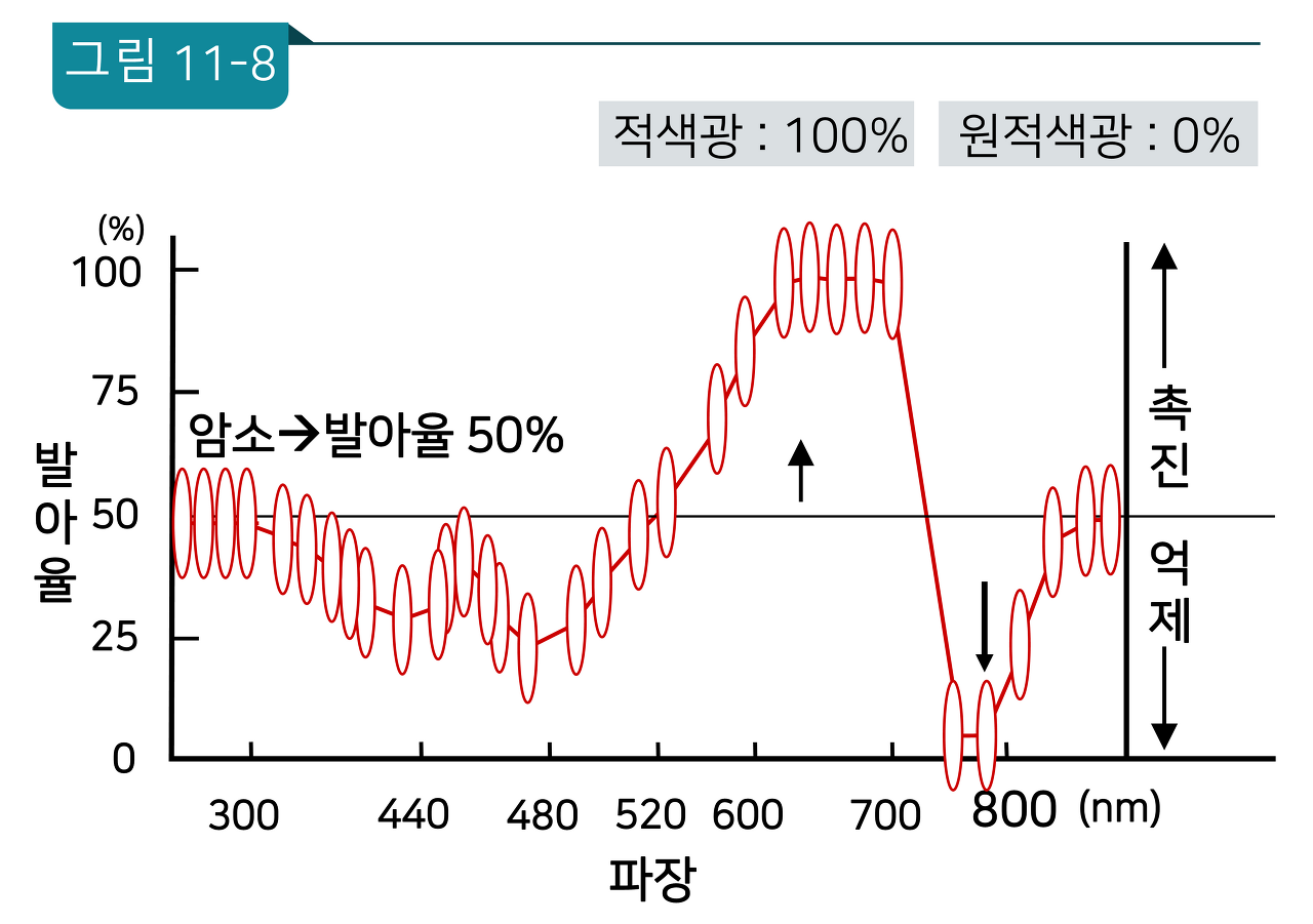 아율이 100% 가깝게 촉진되고, 원적색광을 조사하면 0% 정도까지 발아율이 저해된다. 이