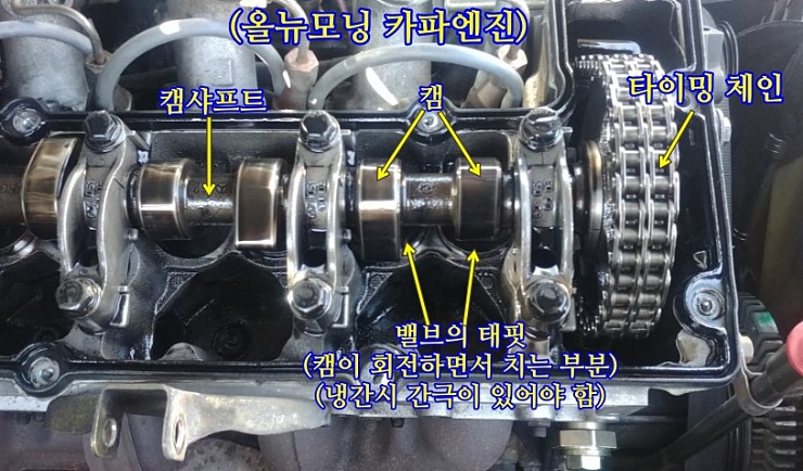 이런 간극 때문에 엔진 냉간시에는 타~타~타~타~ 하는 캠이 태핏을 치는 소리가 나게됨니다.