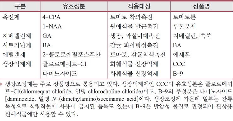 제’로 정의하고 있다. 생장조정제에는 천연 또는 합성 식물호르몬과 그와 유사한 기능을 갖