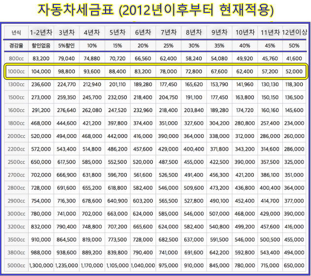 위 표에서 경차 1000cc일 경우, 1-2년차 자동차세금이 교육세 30% 포합해서 104,000원 임니다.