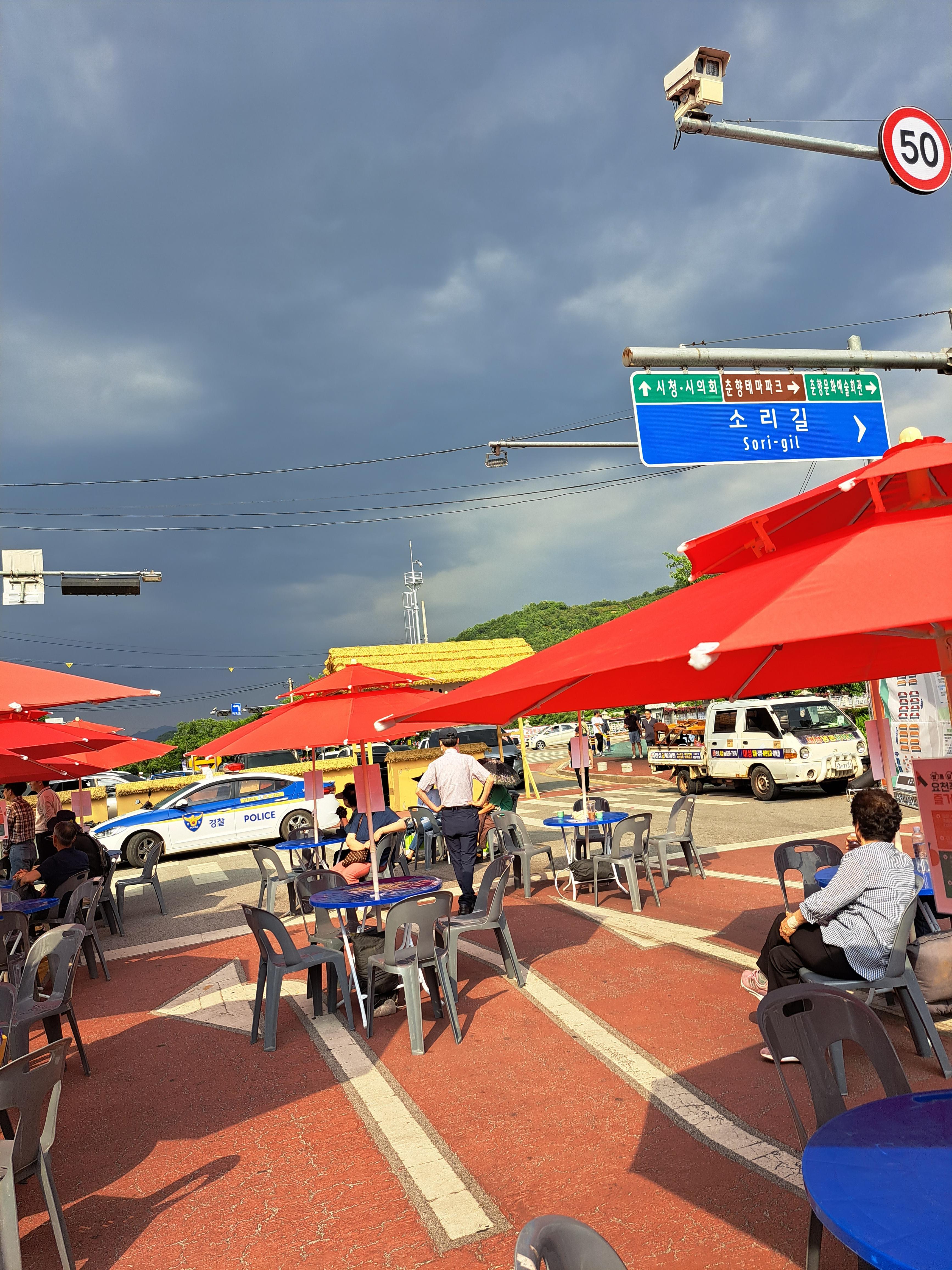 평소에는 도로로 쓰이던 길인데 가운데를 딱 막아 이런 가건물들을 설치 했습니다.