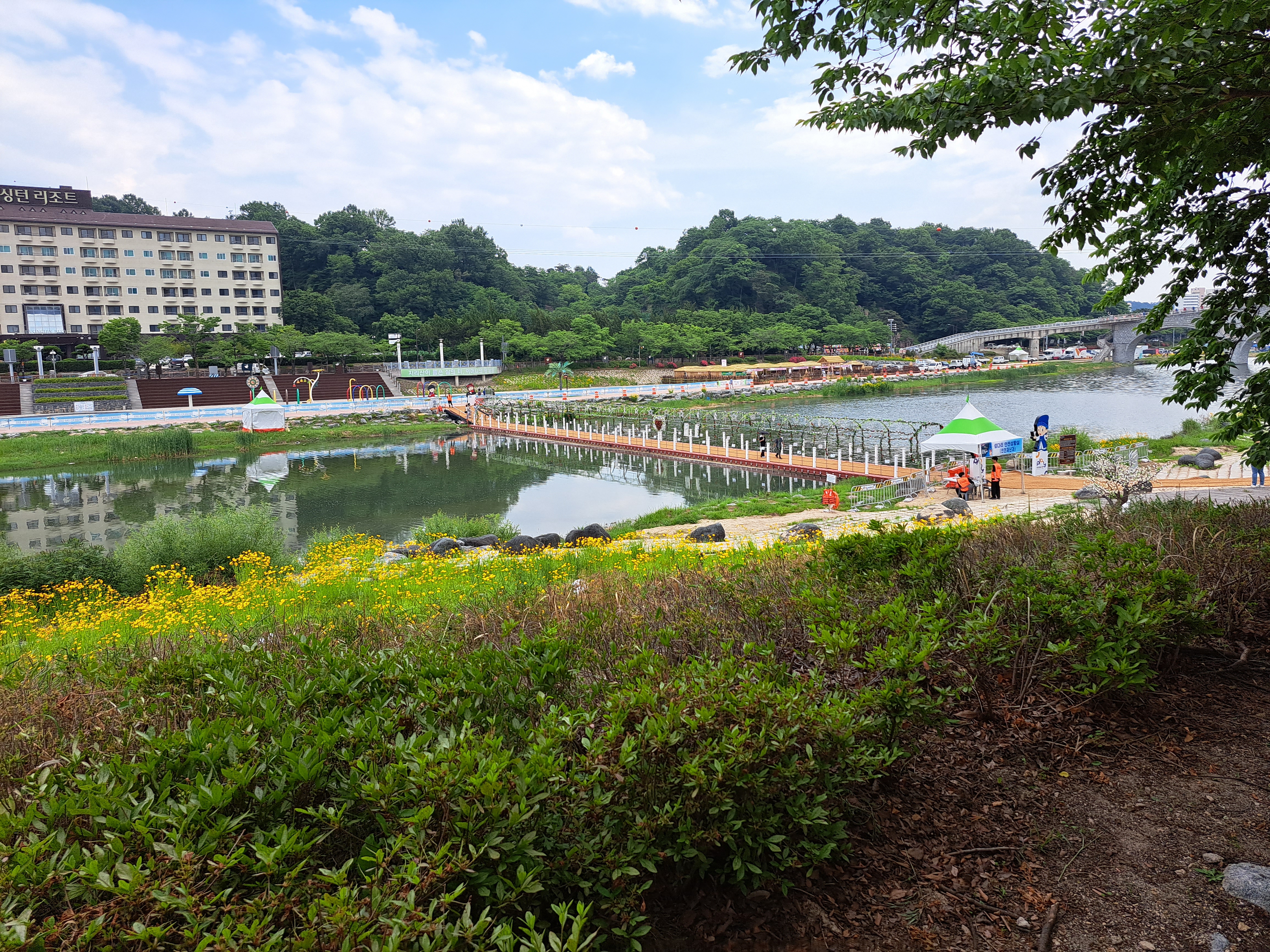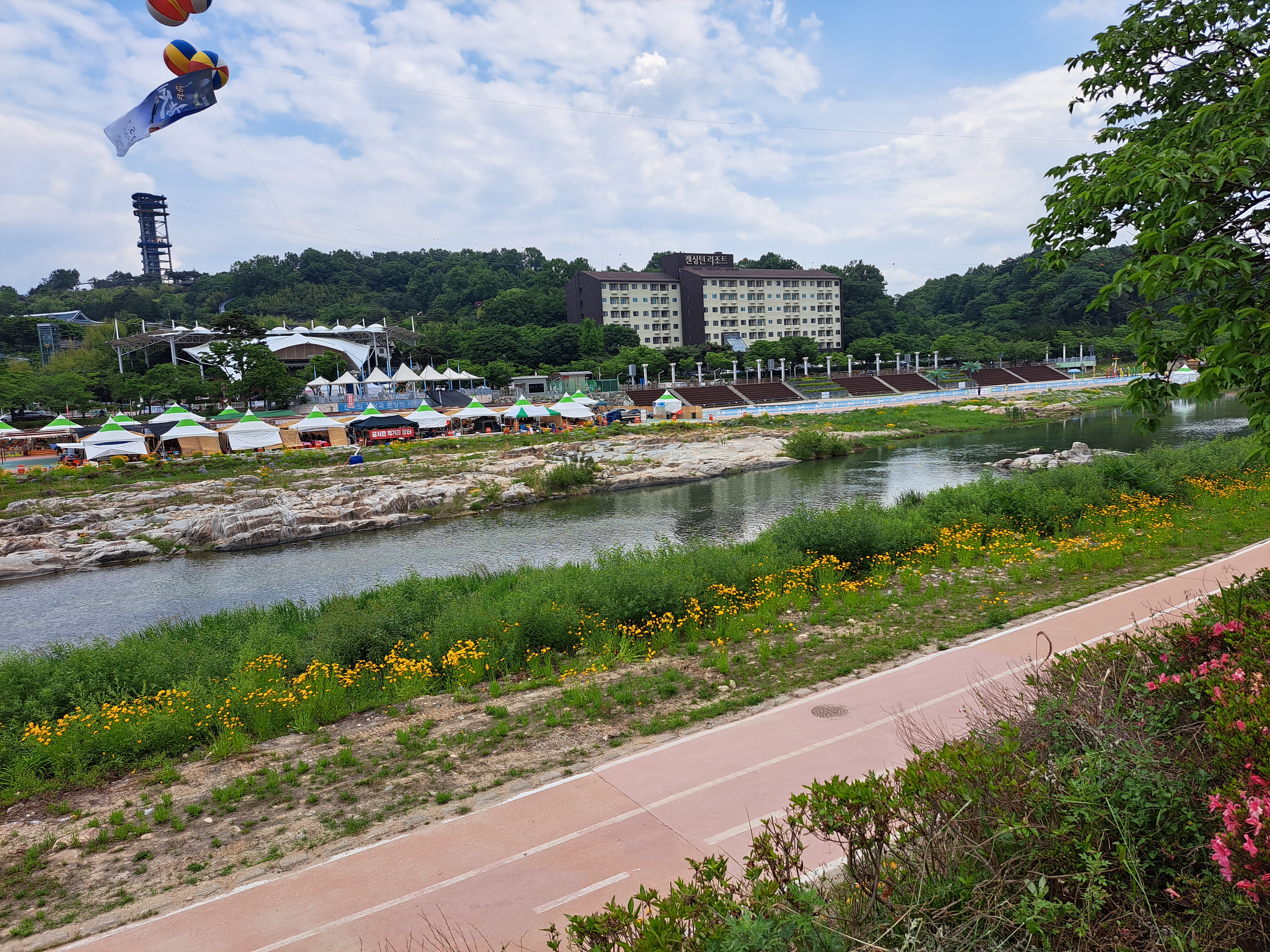 요천주변 멀리 관광올 때 가장 많이 찾는 숙박지인 캔싱턴리조트가 보인다. 왼쪽에 미사일 발사대 같은것은 천문관이다. 한 번 가보고 3000원이 너무 아까웠다.