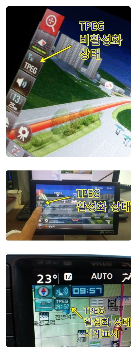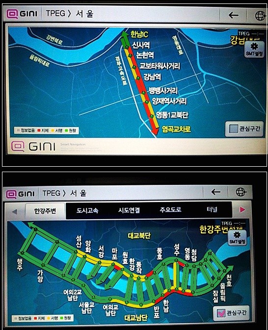 아래 사진들은 내비게이션에서 TPEG 실시간 교통정보가 활성화 되었을때 사진들임니다.