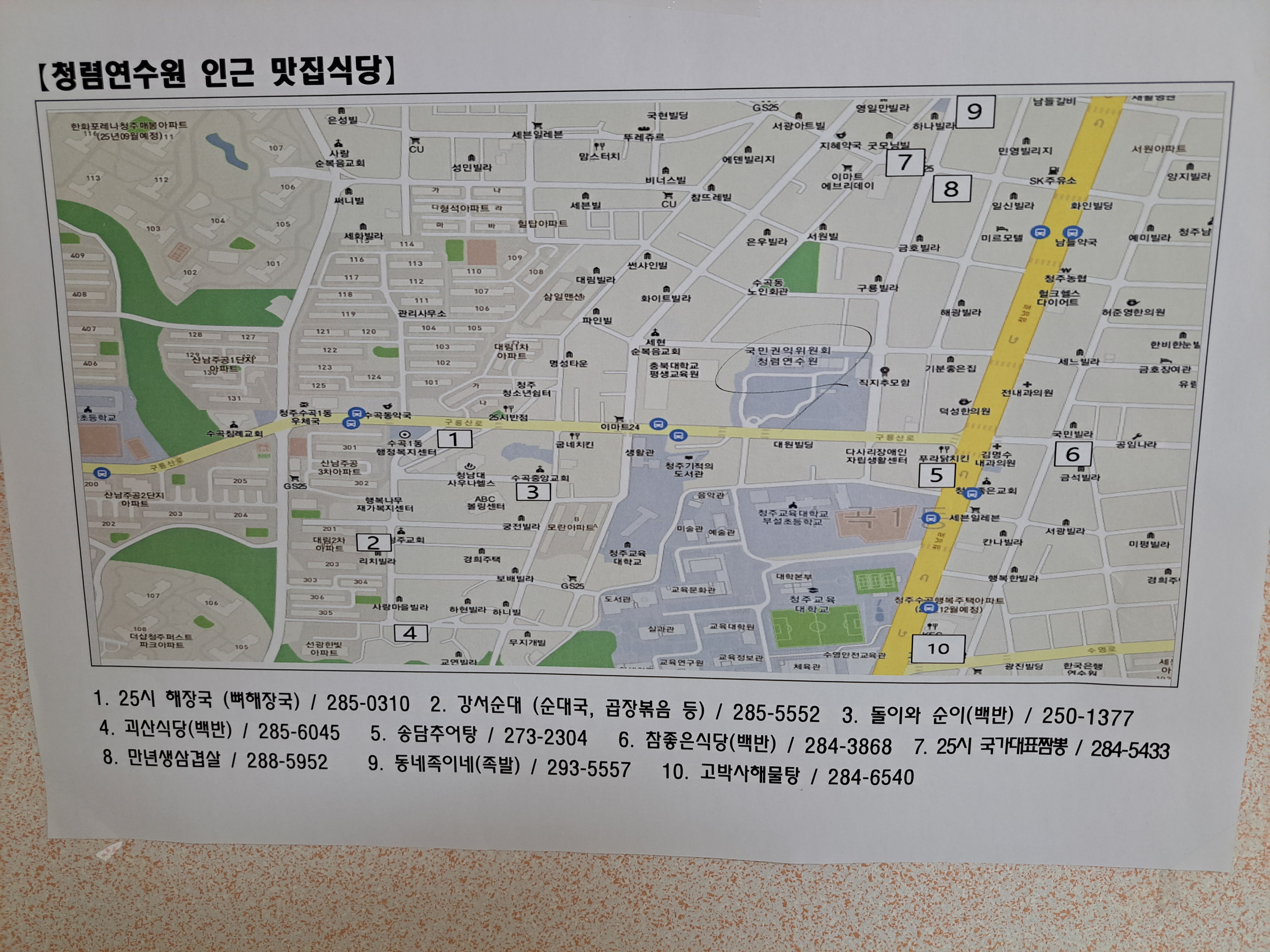 청렴연수원에는 구내식당이 없어 직원들이나 교육생은 다 밥을 나가서 먹는다 직원들에게 하도 맛집을 물어보자 아예 이렇게 만들었다