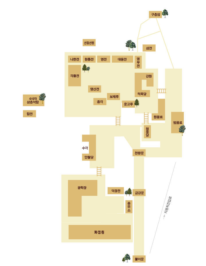 | 종목 : 국보 67호 명칭 : 화엄사각황전 (華嚴寺覺皇殿) 분류 : 사찰건축 수량 : 1동 지정일 : 1962.12.20 소재지 : 전남 구례군 마산면 황전리 12 화엄사 제작시기 : 조선 숙종 25년(1699)부터 약 4년간 소유자 : 화엄사 관리자 : 화엄사 본래 이 자리에는 2층 4면 7칸의 화엄경을 돌에 새기고 황금장육불상을 모신 장육전을 의상조사께서 조성 하였으나 임진란때 소실 되었다. 계파 성능선사(桂波 性能禪師)께서 장육전 중건 불사의 대발원의 백일기도로 문수보살의 선몽으로 공양주 스님이 화주승으로 선택되고, 시주자는 화엄사에서 잔심부름을 해주고 누룽지 따위를 얻어가는 거지노파로 자신의 가난함을 한탄하고 불보살의 원력으로 왕궁에 태어나기를 서원하고 소(沼)에 몸을 던지고 공주로 환생했는데 한쪽 손을 쥔채로 태어났으며 공주는 인경황후(仁敬王后) 막내 딸로 태어났다. 황후는 1680년(숙종6년) 음력 10월 26일 2경(二更: 오후 9시~ 11시)에 경덕궁에서 발병 8일 만에 천연두로 젊은 나이인 20세에 승하했다. 어머니를 여윈 아기 공주는 유모와 나인의 보살핌 속에 자라났다. 5년후 공양주 스님을 만나 손이 펴지니 손바닥에 장육전이라고 쓰여 있었다. 장육전 법당을 짓기 시작할 무렵에 영조(英祖)의 모친(母親)이며 후궁(後宮)인 숙빈최씨(淑嬪崔氏)도 同參하여 숙종 25년(1699)에 시작하여 숙종 28년(1702)에 완공을 보았고, 무릇 2층 48칸으로서 그 장엄함은 비길 데 없었으며, 연잉군(영조)의 원당(願堂)으로 삼고 1703년에는 삼존불(三尊佛)․ 사보살상(四菩薩像)을 완성하여 일주일에 걸쳐 경찬대법회(慶讚大法會)를 열었으며 장육전 중건 불사를 회향하자 조정에서는 사액하여 각황전(覺皇殿)이라 하고, 예조는 한 격 높여서 올려 선교양종대가람(禪敎兩宗大伽藍)이라 하였다. 부처님을 깨달은 왕이란 뜻과 임금님을 일깨워 중건하였다는 뜻으로 각황전이라고 부르게 되었다. 채팽윤(蔡彭胤)이 숙종27년(1701)에 쓴 장육전 중건 상량문 願堂大施主 延礽君 親王子 甲戌生 李氏 壽命長 원당대시주 연잉군 친왕자 갑술생 이씨 수명장 成造大施主 親王子母 戊戌生 崔氏 壽命長 조성대시주 친왕자모 무술생 최씨 수명장 수명 장수 발원하며 연잉군(영조)의 원당(願堂)으로 삼고 영조(英祖)의 모친(母親)이며 후궁(後宮)인 숙빈최씨(淑嬪崔氏)도 조성 대시주로 기록 되어있다. 연잉군은 전생에 농산(農山) 스님이며, 금산사 목정굴에서 백일 관음 기도후 입적하며 숙빈최씨 꿈에 아들로 환생한다고 했다. . 편액은 1703년에 형조참판 이진휴(李震休)가 썼다. 영조 45년(1769) 자운(慈雲), 처관(處寬)선사가 중수, 헌종13년(1847년) 의헌(義憲), 윤행(允幸), 도실(道實)스님이 중수, 1927년 8월 박 사시화(朴 四時華), 김 청정화(金 淸淨華) 등이 시주로 각황전 보살상(관세음, 보현, 문수, 지적)을 개금 하였다. 1936년 정만우스님이 보수, 1973년에 불보살 개금불사를 도광스님이 하셨고, 1997년에 불단 해체보수, 불보살개금불사, 법당마루 불사를 종열스님이 했으며, 1999년에 종걸스님이 탑 모양 인등설치, 2006년에 각황전 법당 뒤에 영가 영구위패단 및 아미타불 입상을 종삼스님이 조성했으며, 2012년 10월 5일에 법당뒤에 방화된 문짝을 2013년 2월에 교체 하였다. 영관 주지스님이 2014년 4월 9일 종걸 주지 스님이 설치한 각황전 탑형태 불등단을 철거하고 닺집 형태 불등단(佛燈壇)을 설치했다. |