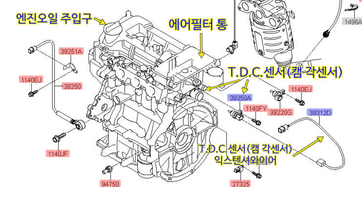 <▼ 올뉴모닝 캠샤프트 위치센서 장착 위치 도면1 ▼> <-- WPC 부품검색에서는 1개만 나옴니다.