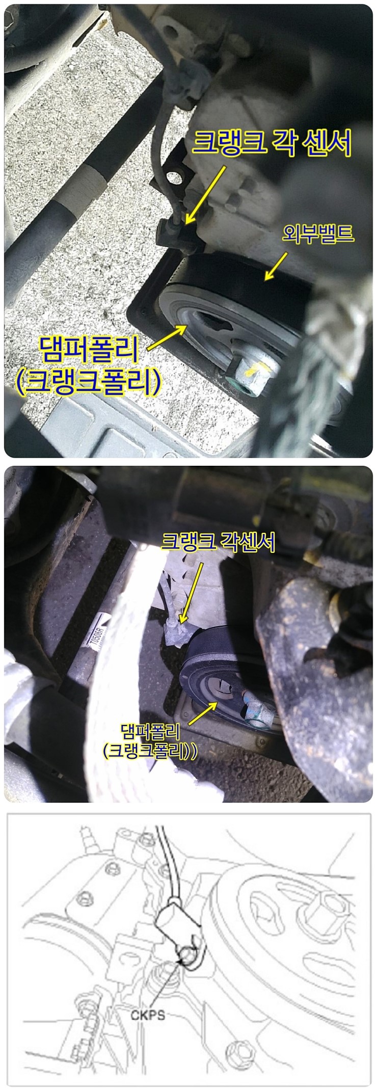 그러나 올뉴모닝의 경우, 차량을 리프트로 뛰우기만 하면 크랭트 샤프트 각센서가 댐퍼폴리 옆에 붙어