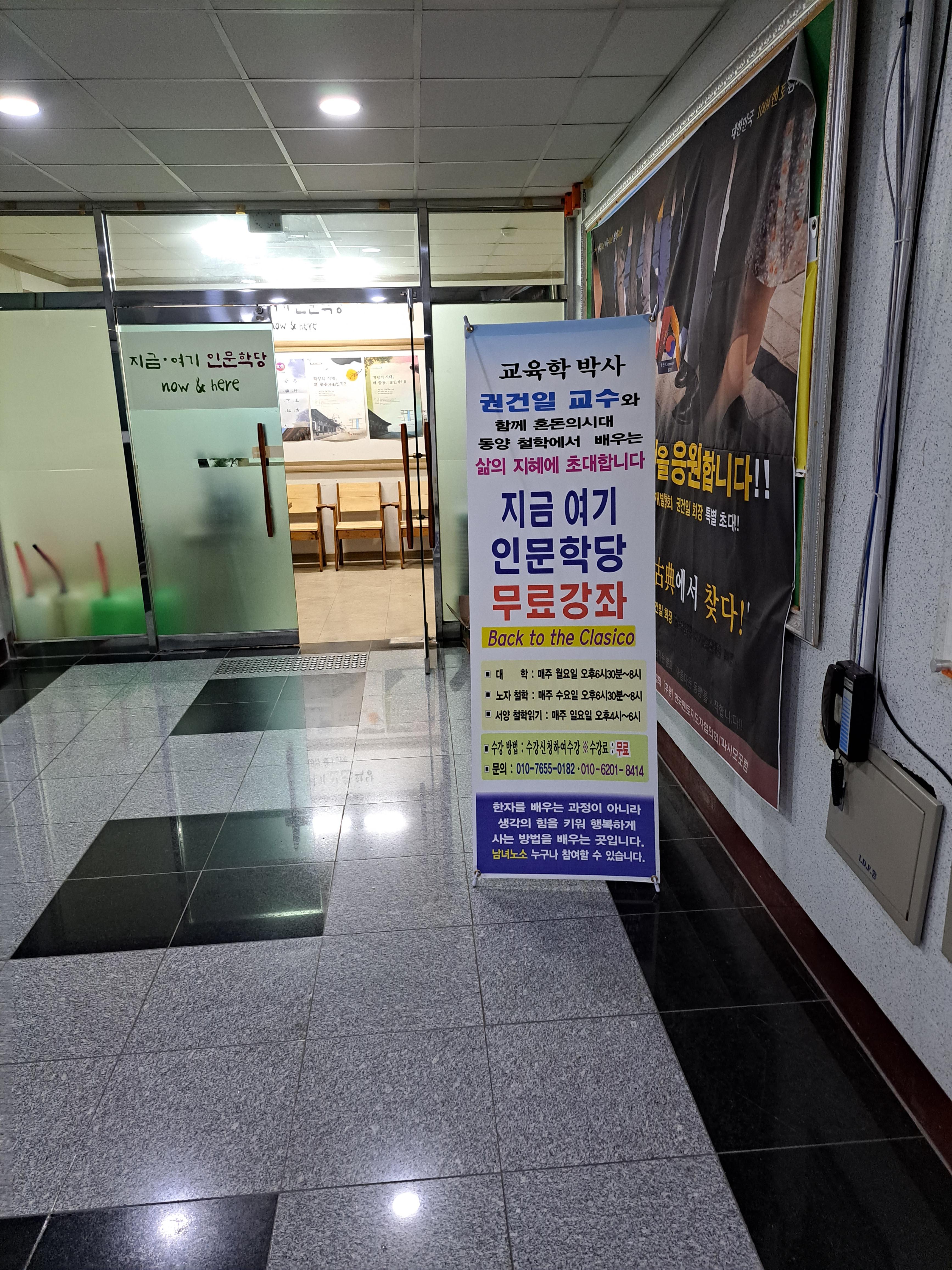 수강료 무료라는 글씨가 인상적 일주일에 두번 노자철학에 대해 배웁니다.